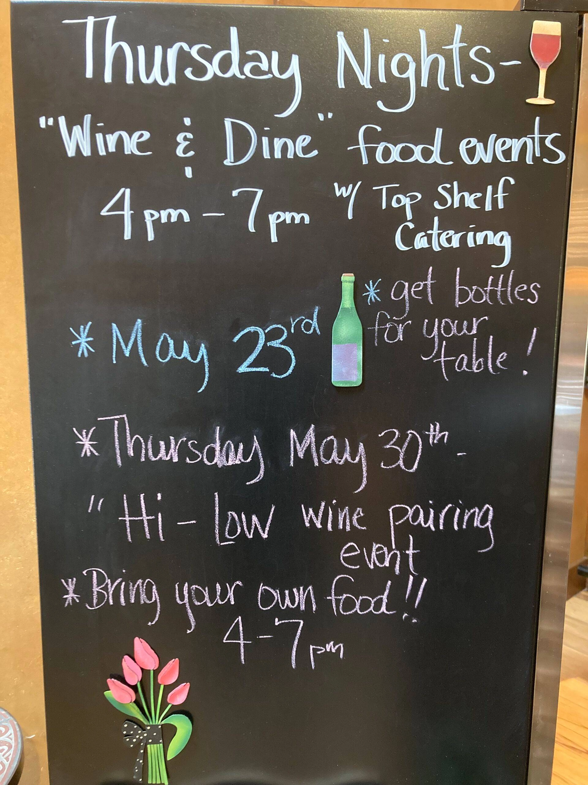 Thursday Nights 4-7 pm – Food and wine events start May 23rd! Mark your calendars! Food truck, outdoor patio, open bottles of wine for your table and more! See you all on Thursday nights! No reservations, first come first served.