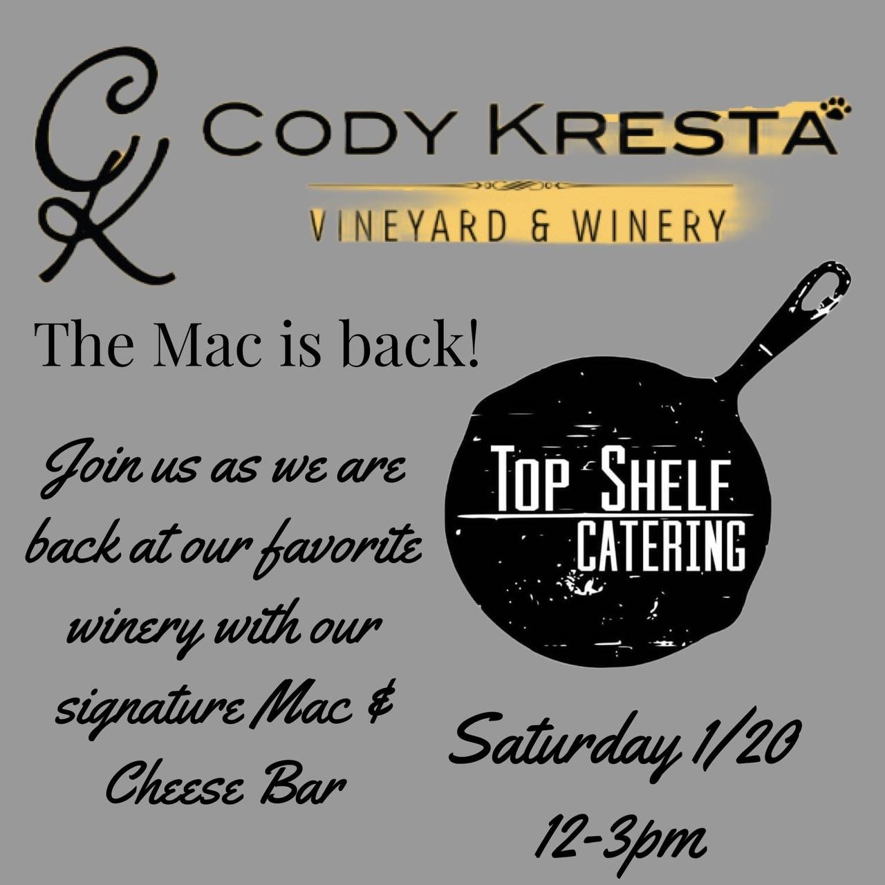 Come on out and warm up with Top Shelf Catering and their Gourmet Mac & Cheese Bar!!! Mac & Cheese with all the toppings!!! New tasting menu, more wines to enjoy, shopping and heated igloos!! Celebrate winter with us!! See you all Saturday 😉